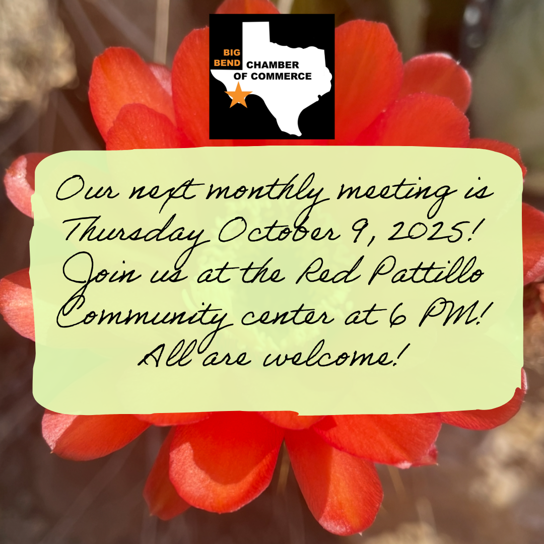 The BIG BEND CHAMBER OF COMMERCE is dedicated to “Promoting our local businesses and the unique character of Brewster County and the Big Bend area”, a community that covers several thousand square miles of deep West Texas.